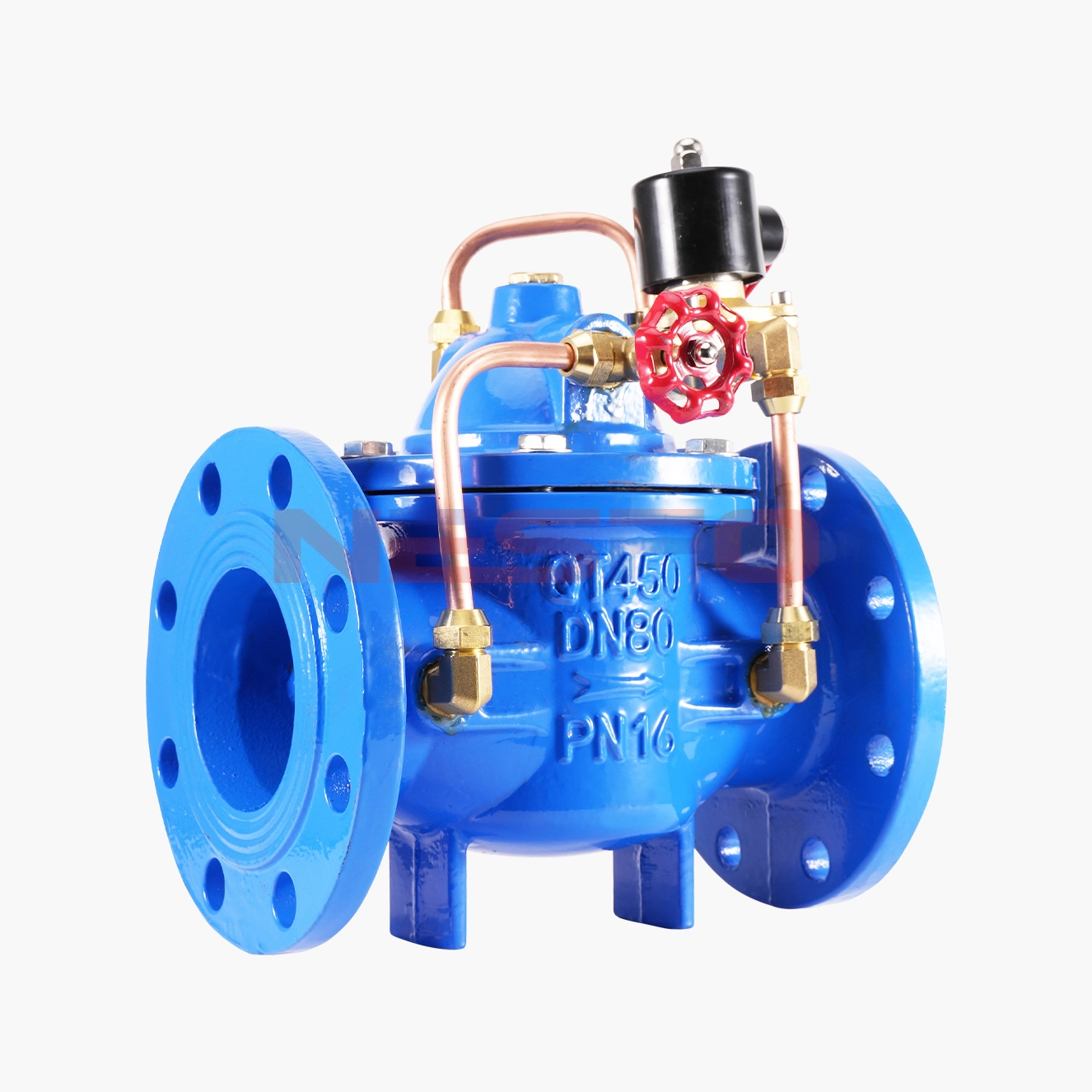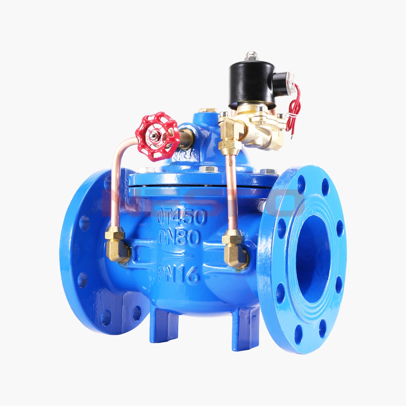 600X电动控制阀由主阀、电磁导阀、针阀、球阀、微形过滤器和压力表组成水力控制接管系统。通过电磁导阀可以实现对阀门开启和关闭的遥控。加装附加装置后,可控制开启和关闭的速度。电控水力控制阀利用导阀控制阀门的开启和关闭,节省能源。可代替其它阀门大型电动装置。电控水力控制阀产品用于高层建筑、生活区等供水管网系统及城市供水工程。600X电动控制阀是一种以电磁阀为向导阀的水力操作式阀门。常用于给排水及工业系统中的自动控制,控制反应准确快速,根据电信号遥控开启和关闭管路系统,实现远程操作。600X电动控制阀可取代闸阀和蝶阀用于大型电动操作系统。阀门关闭速度可调,平稳关闭而不产生压力波动。该阀门体积小、重量轻、维修简单、使用方便。电磁阀可选用交流电220V,或直流电24V,可根据场合选用常开或常闭型均可。