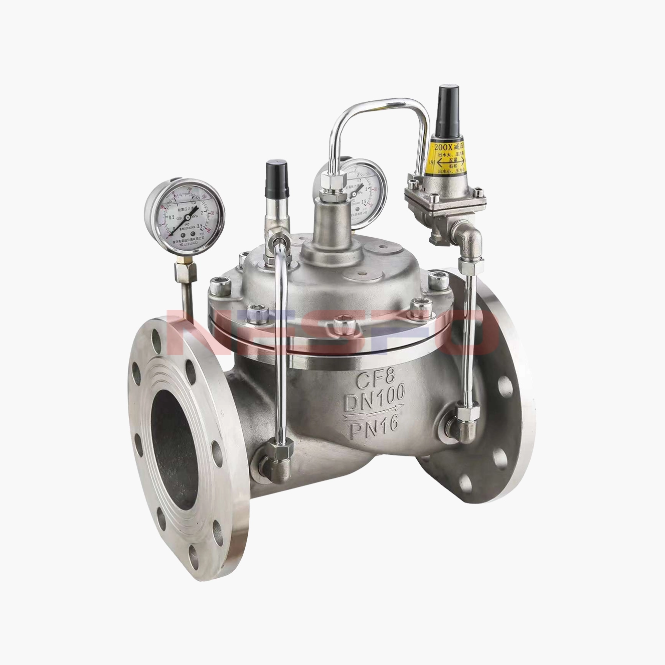 200X可调式减压阀由主阀、导阀、针阀、球阀、微型过滤器和压力表组成水力控制接管系统。使用时,当调定出口压力后,能自动保持稳定出口压力。本产品利用导阀自力控制,不需要其它装置和能源,保养简便,压力控制准确度高,受进口压力和流量影响小,减压稳压可靠。本系列阀门产品广泛用于高层建筑、生活区等供水管网系统及城市供水工程。