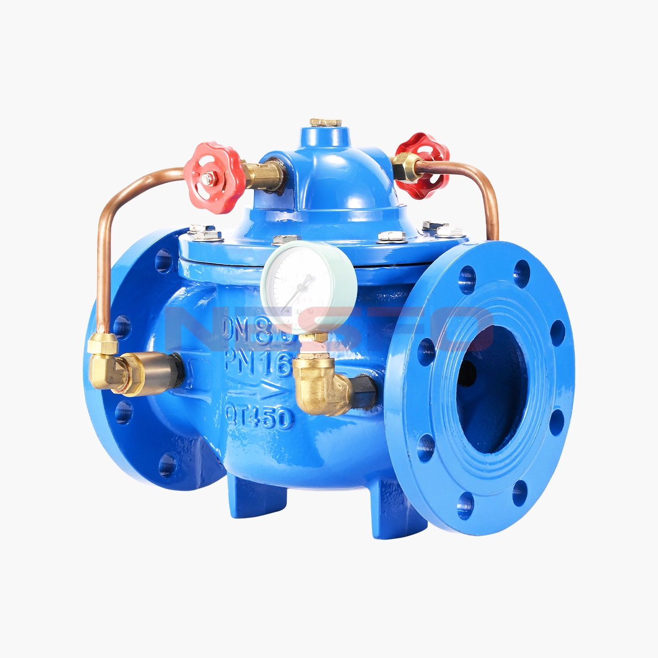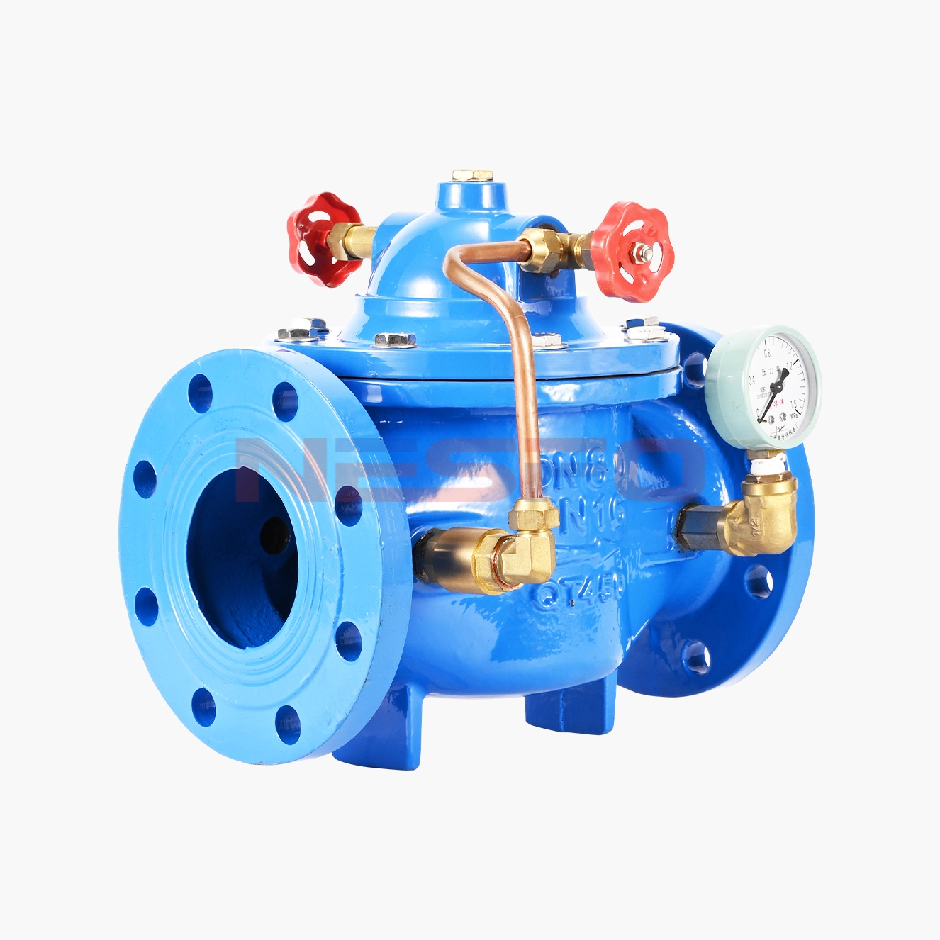 300X缓闭式止回阀由主阀、单向阀、针型阀、球阀、微形过滤器和压力表组成水力控制接管系统。利用水力自动操作,可使主阀得到迅速的开启或缓慢的关闭速度。防止水锺水击的产生,以达到缓闭消声的效果。当缓闭止回阀从进口端给水时,水通过微形过滤器、针型阀、单向阀进入主阀控制室,再经过球阀排水至下游。因为针型阀开度小于球阀开度,即主阀控制室的排水速度大于进水速度,因此控制室压力降低,作用于主阀盘下端的进口压力打开主阀向下游供水。当管道停止供水时,若下游水开始回流,一部分回流水经球阀进入主控制室,由于单向阀作用,回流水不能从主控制室流出,引起主控制室逐渐升压,缓缓关闭主阀。