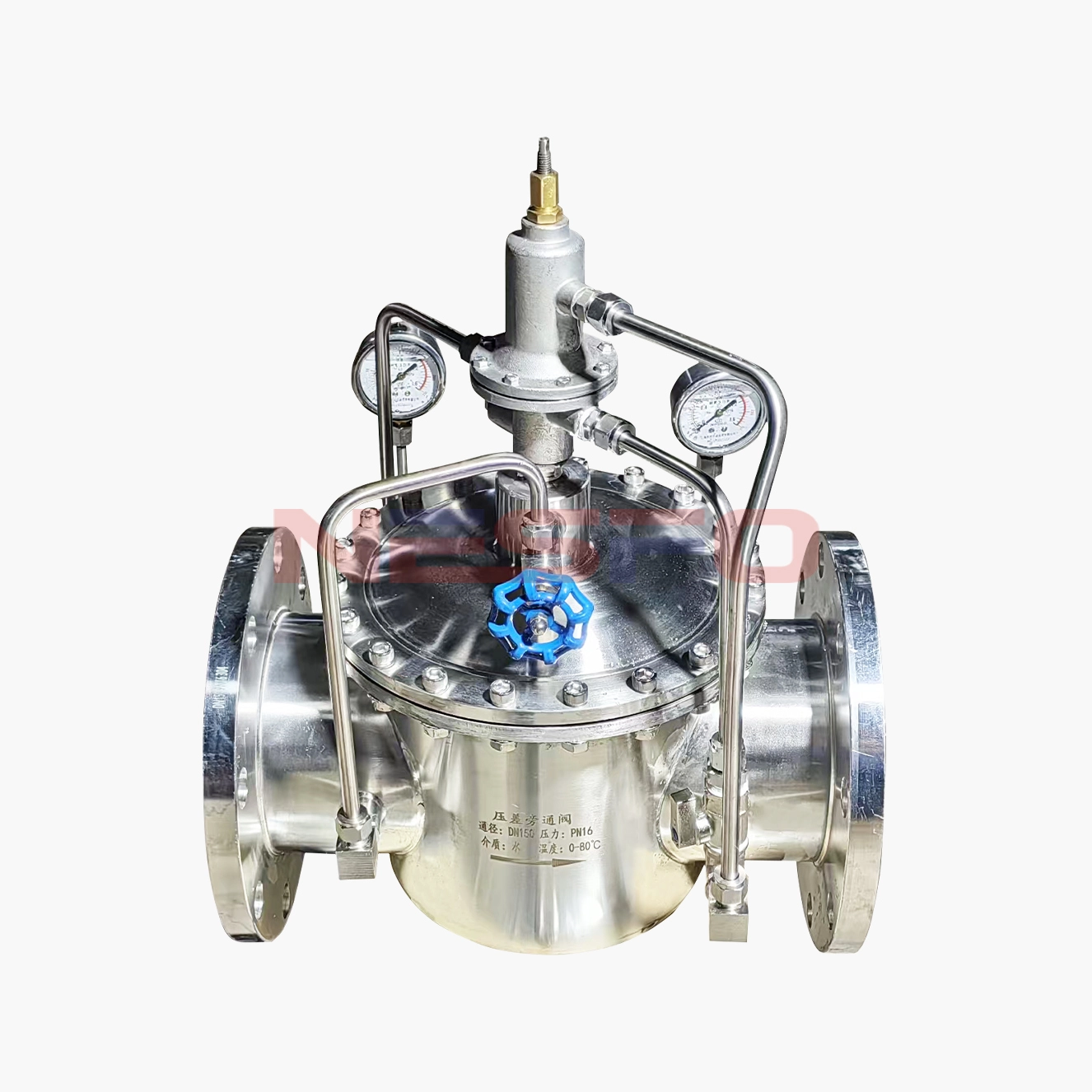 800X压差旁通阀由主阀、压差控制导阀、针阀、球阀、微形过滤器和压力表组成水力控制接管系统。通过设计的导阀控制室,对压力变化信号进行比较,输出主阀开度信号,控制主阀开度,从而控制主阀的进出口压差在设定值上。本产品利用水力自力控制,不需要其它装置和能源,保养简便。本系列阀门产品用于高层建筑、生活区等供水管网系统及城市供水工程。升压,推动膜片关闭主阀。