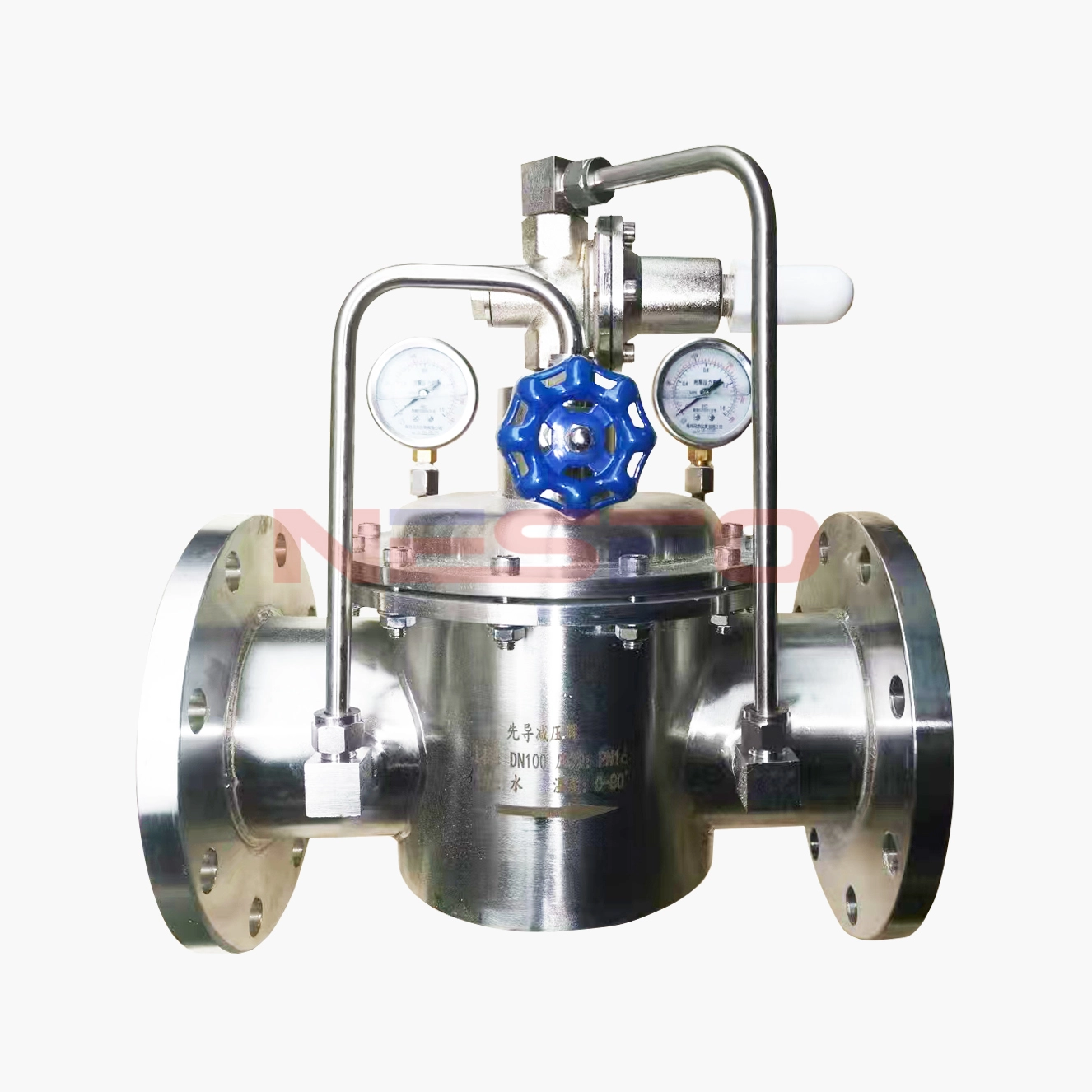 当阀门从进口端给水时,水流过针阀进入主阀控制室,出口压力通过导管作用到导阀上。当出口压力高于导阀弹簧设定值时,导阀关闭。控制室停止排水,此时主阀控制室内压力升高并关闭主阀,出口压力不再升高。当阀门出口压力降到导阀弹簧设定压力时,导阀开启,控制室向下游排水。由于导阀系统排水量大于针阀的进水量,主阀控制室压力下降。进口压力使主阀开启。在稳定状态下,控制室进水、排水相同,主阀开度不变,出口压力稳定。调节导阀弹簧即可设定出口压力。